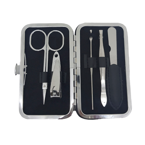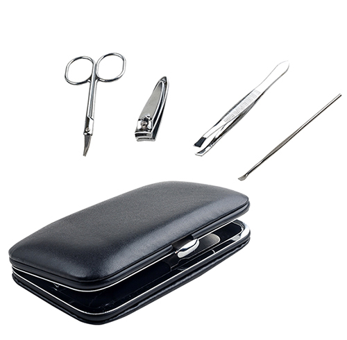 tuche de manicure en curipiel. Incluye cortauñas, pinzas para depilar, tijeras, empujador de cutícula y lima.