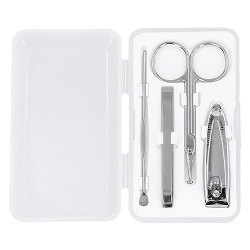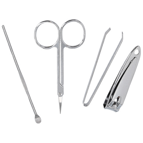 Set de manicure en estuche de plástico con 4 piezas: tijeras, cortauñas, pinzas para depilar y empujador de cutícula.