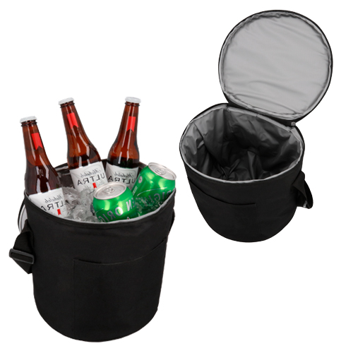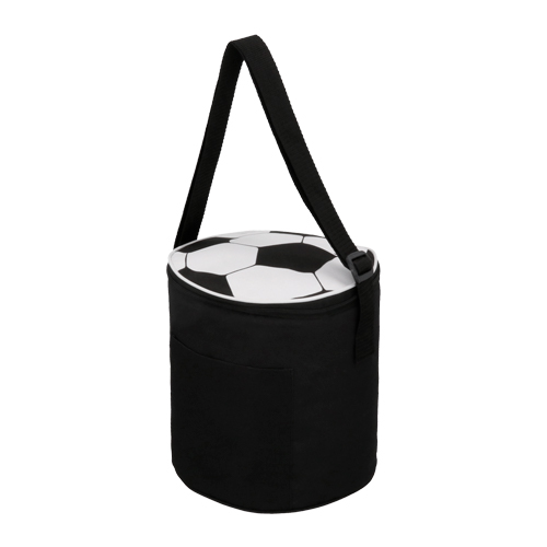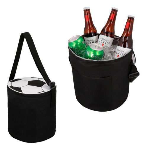 Hielera circular con diseño de balón de soccer en la parte superior. Cuenta con interior impermeable plastificado, correa ajustable y un compartimento frontal.