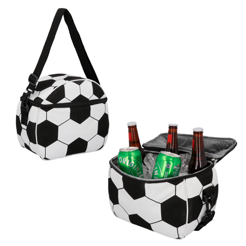 Hielera con diseño de balón de soccer con interior impermeable plastificado y correa ajustable.